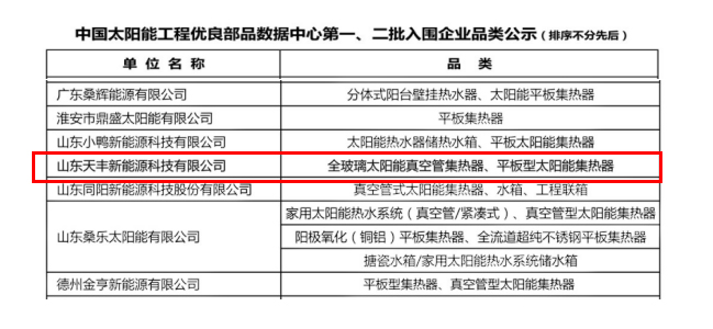 2018年10月,全國(guó)首個(gè)“中國(guó)太陽能工程優(yōu)良部品數(shù)據(jù)中心”成立,山東天豐新能源科技有限公司太陽能系列產(chǎn)品成功首批入圍!