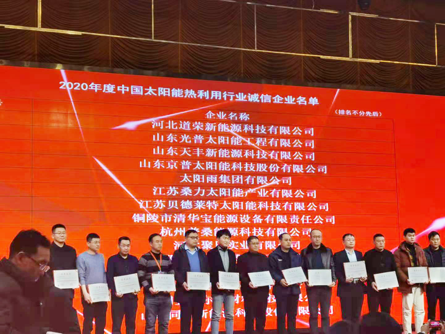 12月8日,2020年中國太陽能熱利用行業(yè)年會在邢臺召開,山東天豐新能源科技有限公司受邀參加本次會議,在會上,天豐新能源再度蟬聯(lián)“中國太陽能熱利用行業(yè)誠信企業(yè)”稱號,并獲頒榮譽證書。