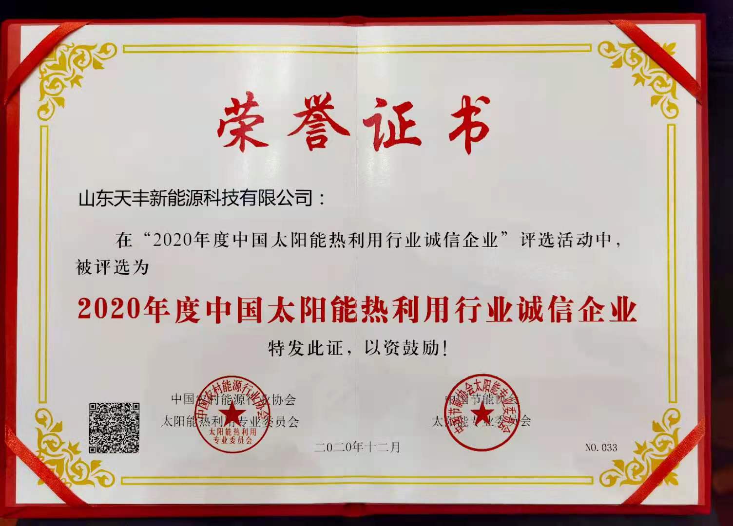 人無信而不立,企業(yè)亦然。早在2019年,天豐便獲得“中國太陽能熱利用行業(yè)誠信企業(yè)”榮譽證書,本次再度斬獲該項殊榮,傳達出行業(yè)對天豐在誠信經(jīng)營、企業(yè)信用體系建設(shè)、維護合同信用等方面的充分肯定。